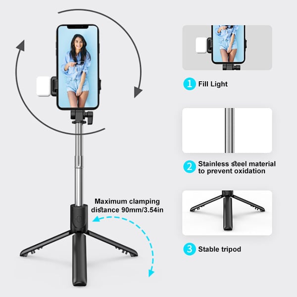 A szelfibot kihúzható markolattal és állvánnyal rendelkezik. Nyisd ki az alsó tripodot, és asztali állványként is használható. Maximális kinyújtott magassága 43 inch (kb. 109 cm), így szelfibotként vagy tripodként is tökéletes.